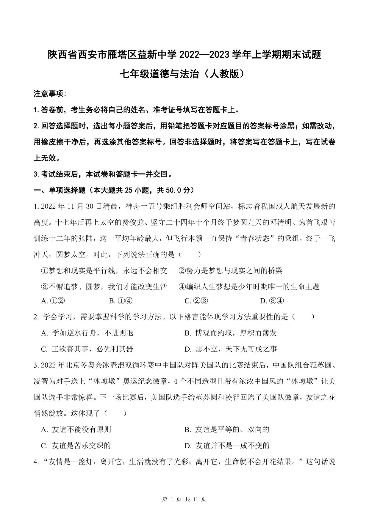 陕西省西安市雁塔区益新中学2022—2023学年上学期期末试题七年级道德与法治(人教版)