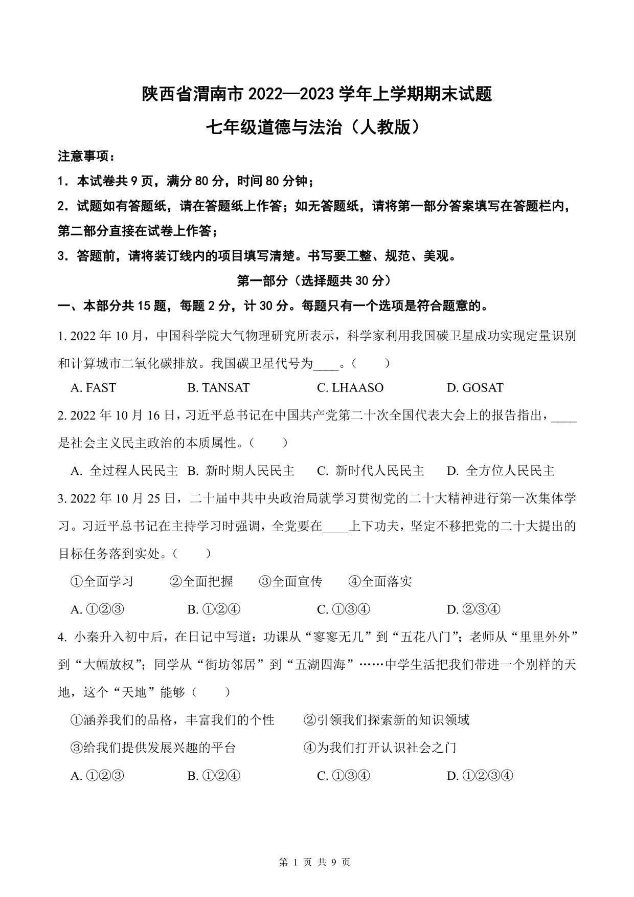 陕西省渭南市2022—2023学年上学期期末试题七年级道德与法治(人教版)
