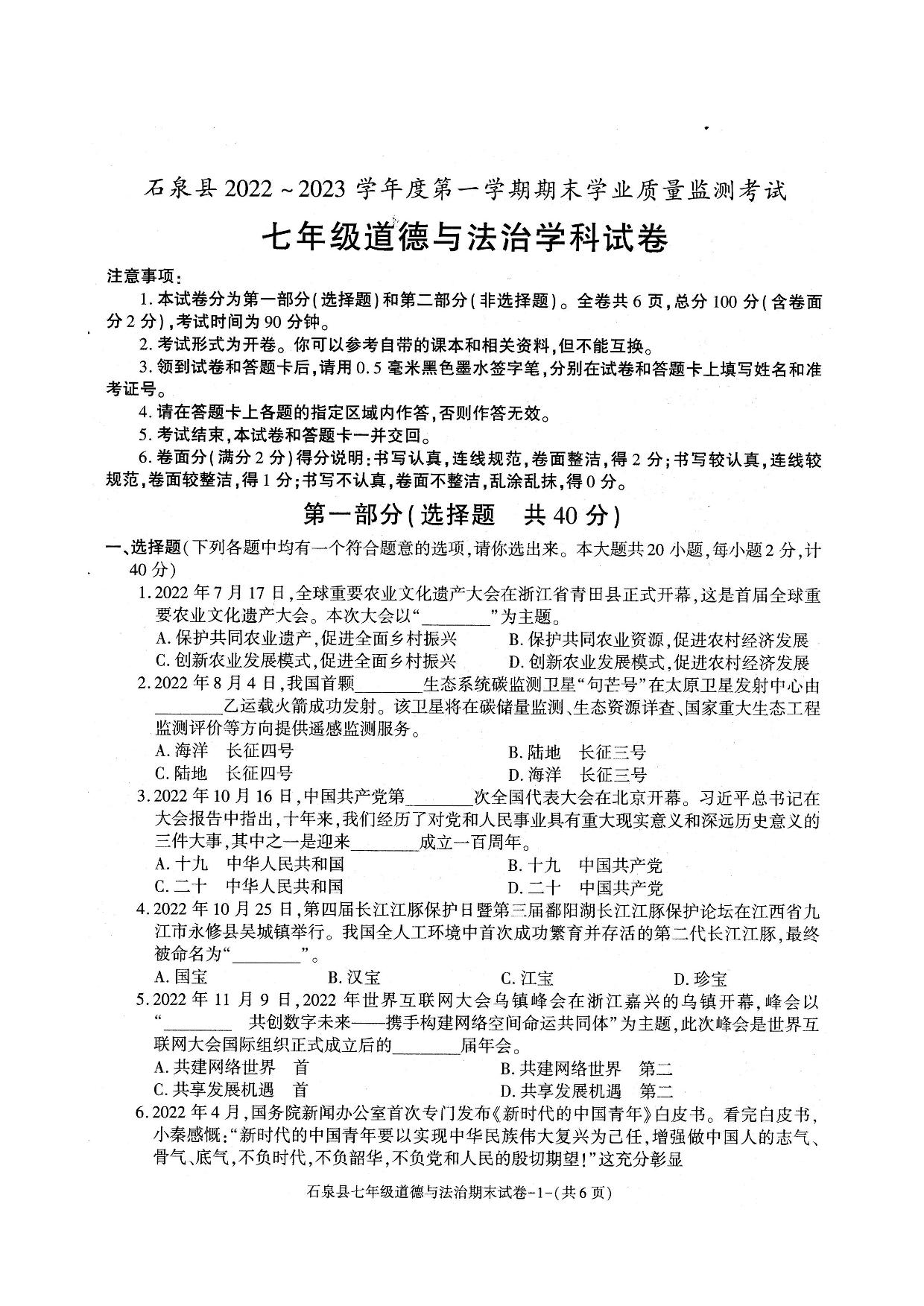 陕西省安康市石泉县2022—2023学年上学期期末试题七年级道德与法治(人教版)