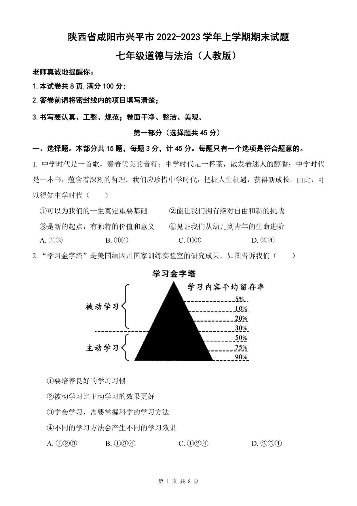 陕西省咸阳市兴平市2022—2023学年上学期期末试题七年级道德与法治(人教版)