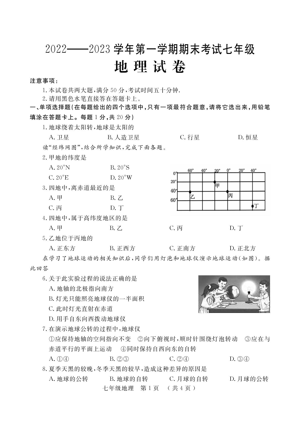 七年级地理人教版上册期末卷