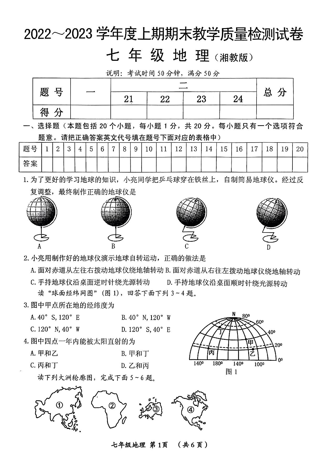 七年级地理湘教版上册期末卷