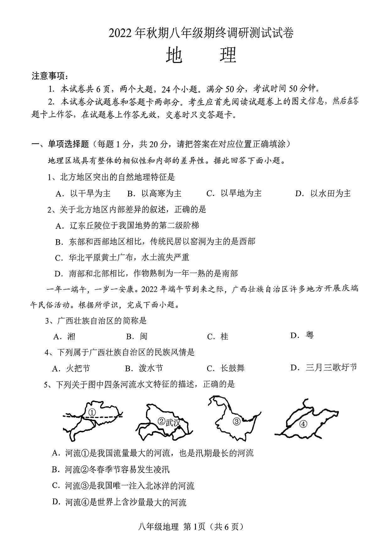 河南省南阳市第五完全学校2022年秋期期终调研测试试卷八年级地理(人教版)