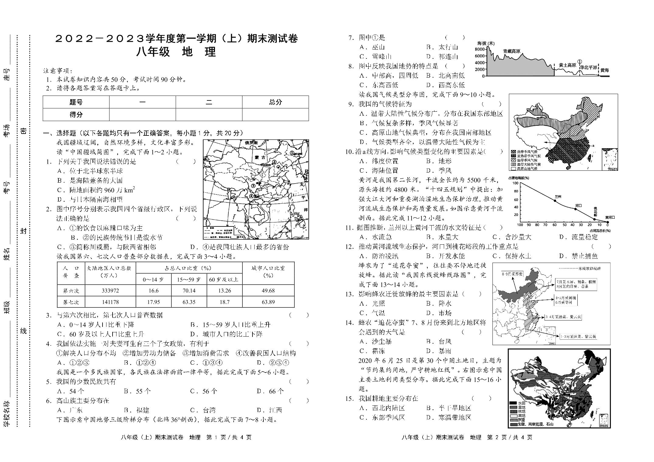 河南省商丘市永城市2022-2023学年度第一学期(上)期末测试卷八年级地理(人教版)