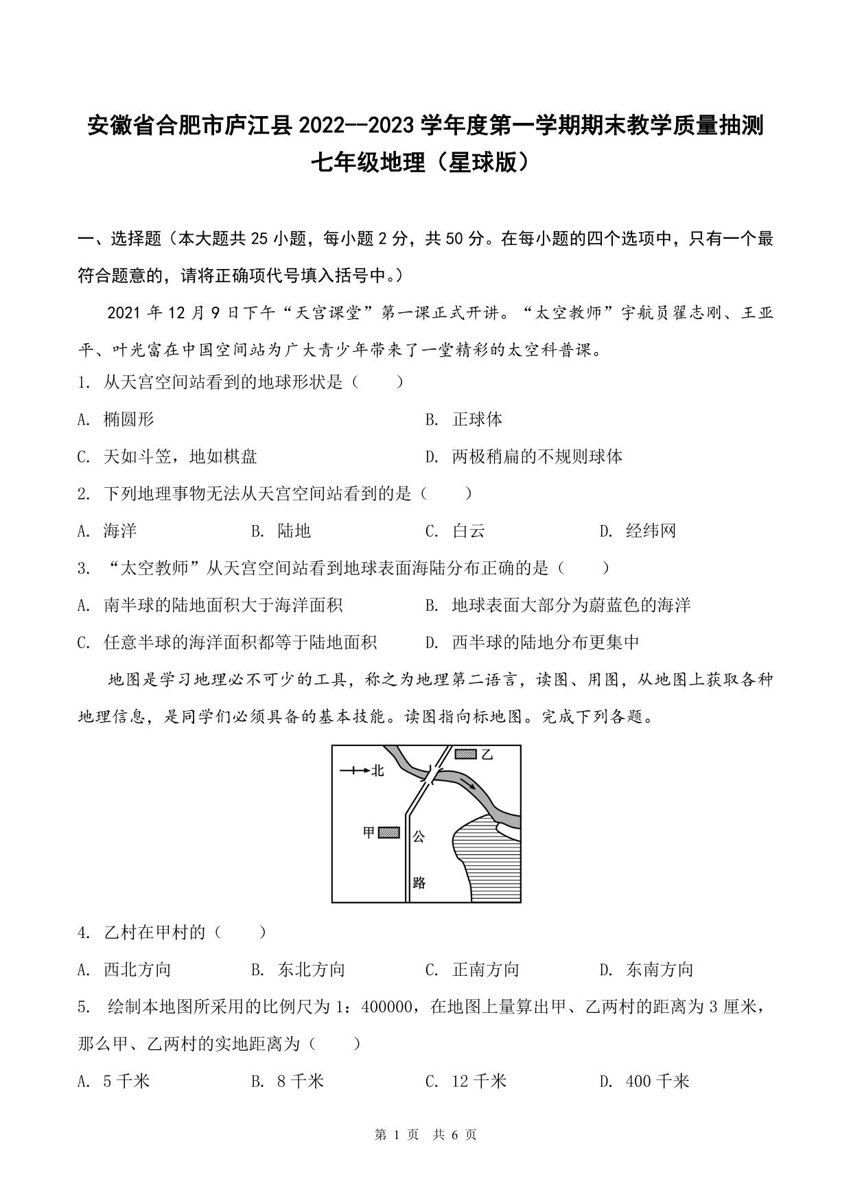 安徽省合肥市庐江县2022-2023学年度第一学期期末教学质量抽测七年级地理(星球版)