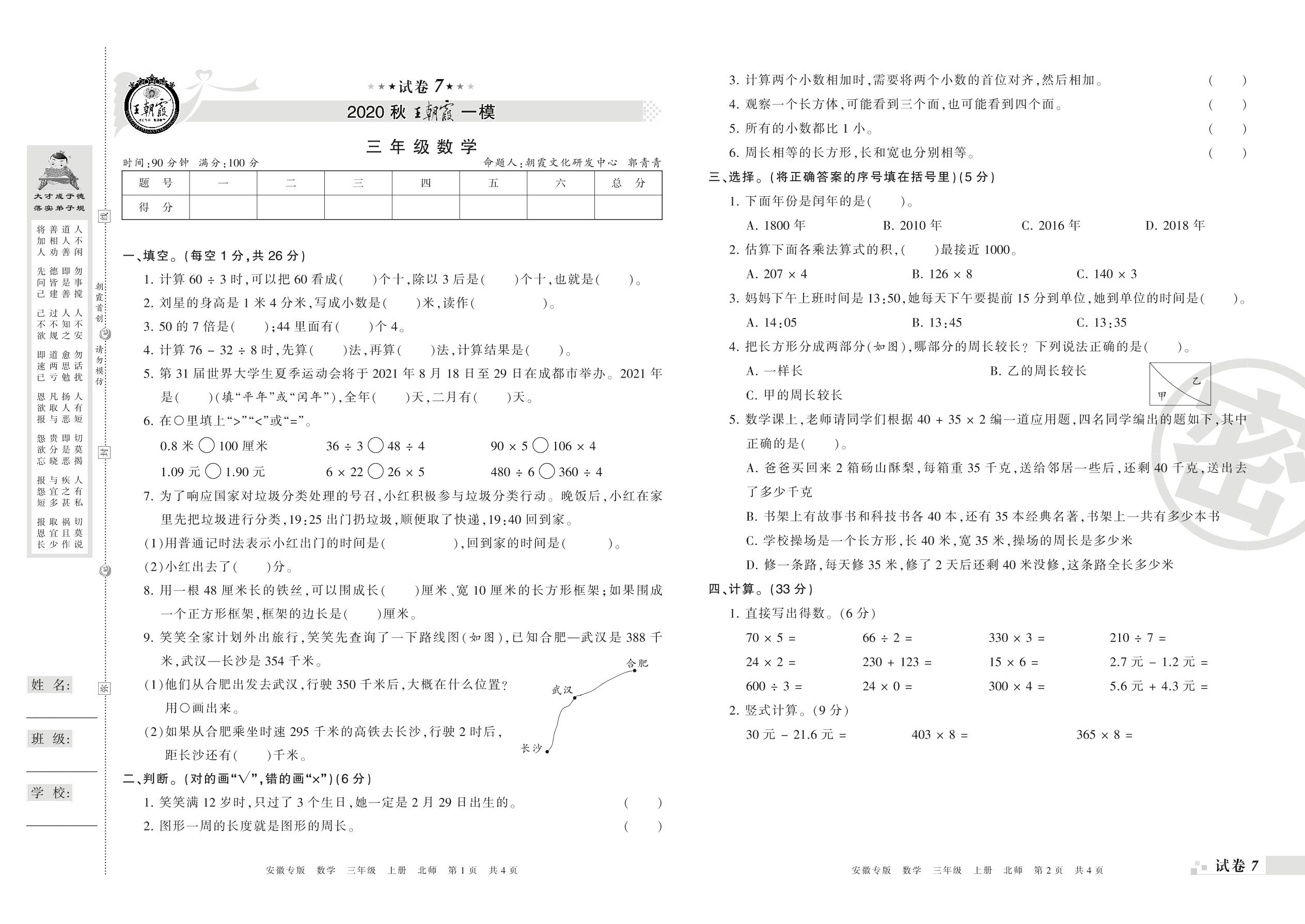 王朝霞期末模拟卷三年级上册数学(北师版)_R21080492123【7】