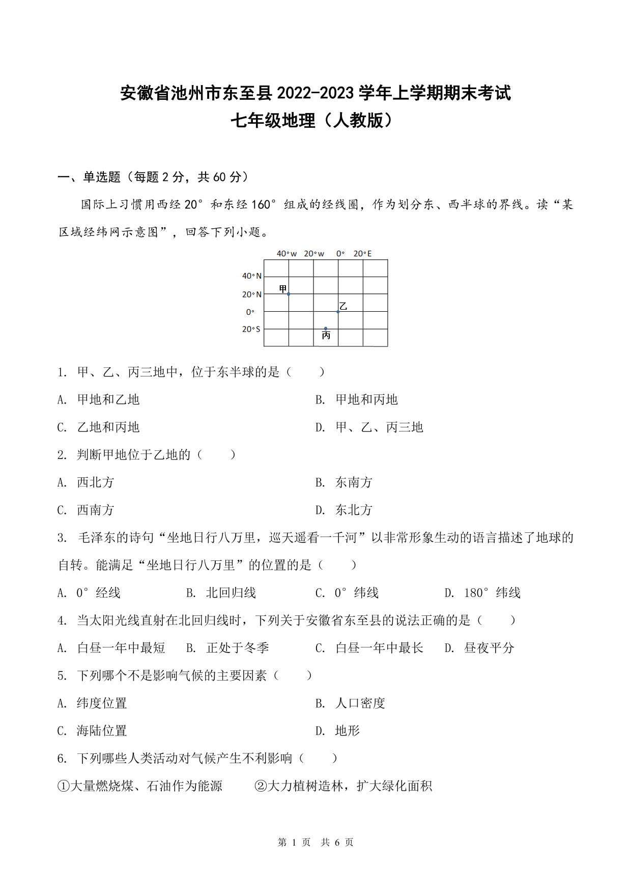 安徽省池州市东至县2022-2023学年上学期期末考试七年级地理(人教版)