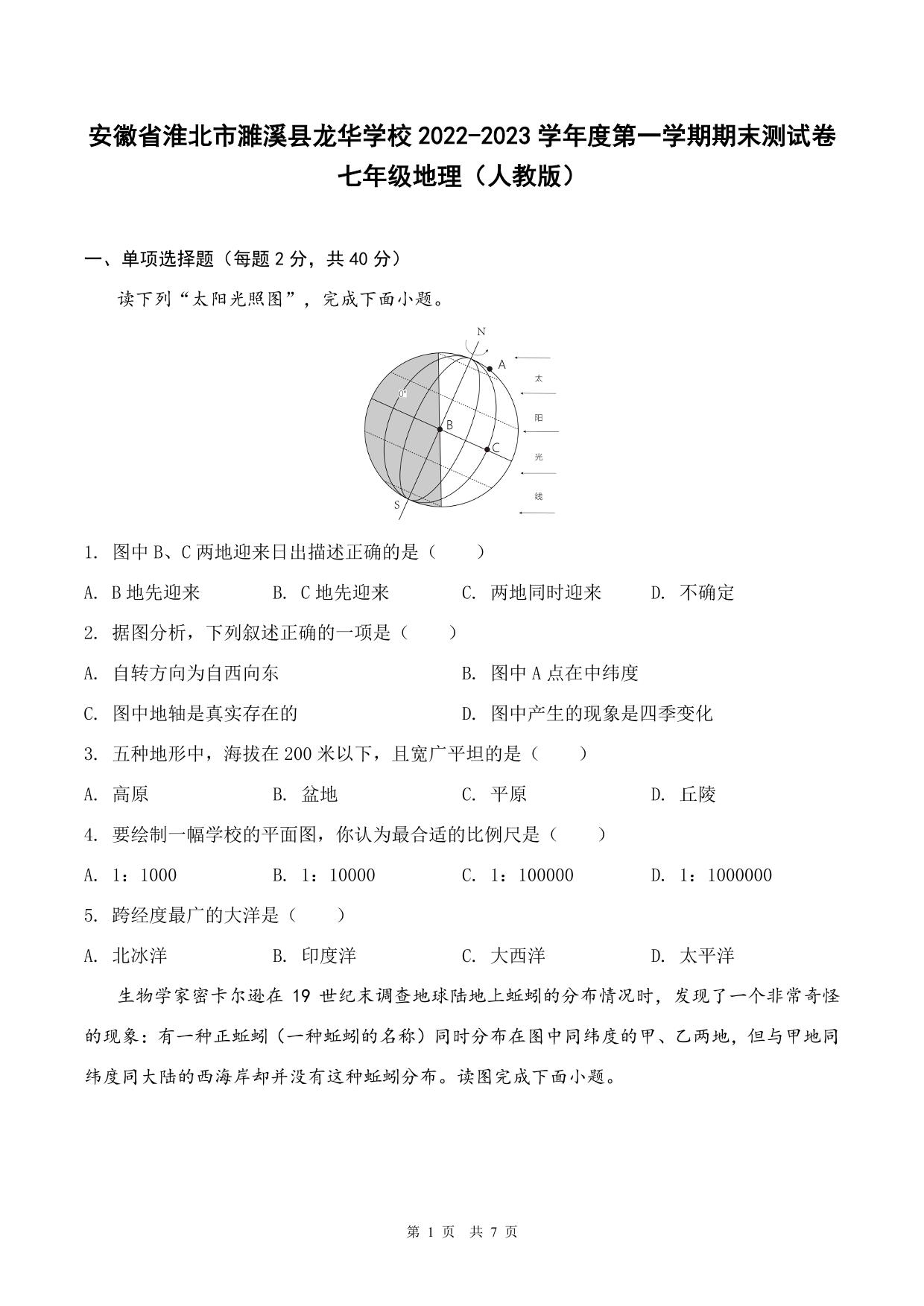 安徽省淮北市濉溪县龙华学校2022-2023学年度第一学期期末测试卷七年级地理(人教版)