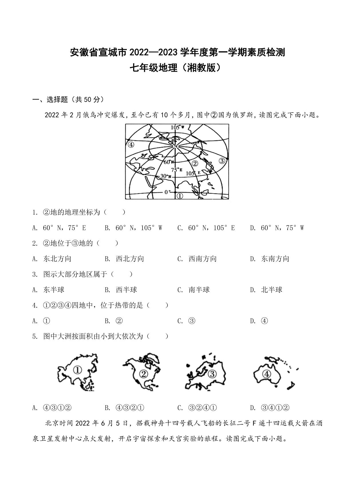 安徽省宣城市2022-2023学年度第一学期素质检测七年级地理(湘教版)