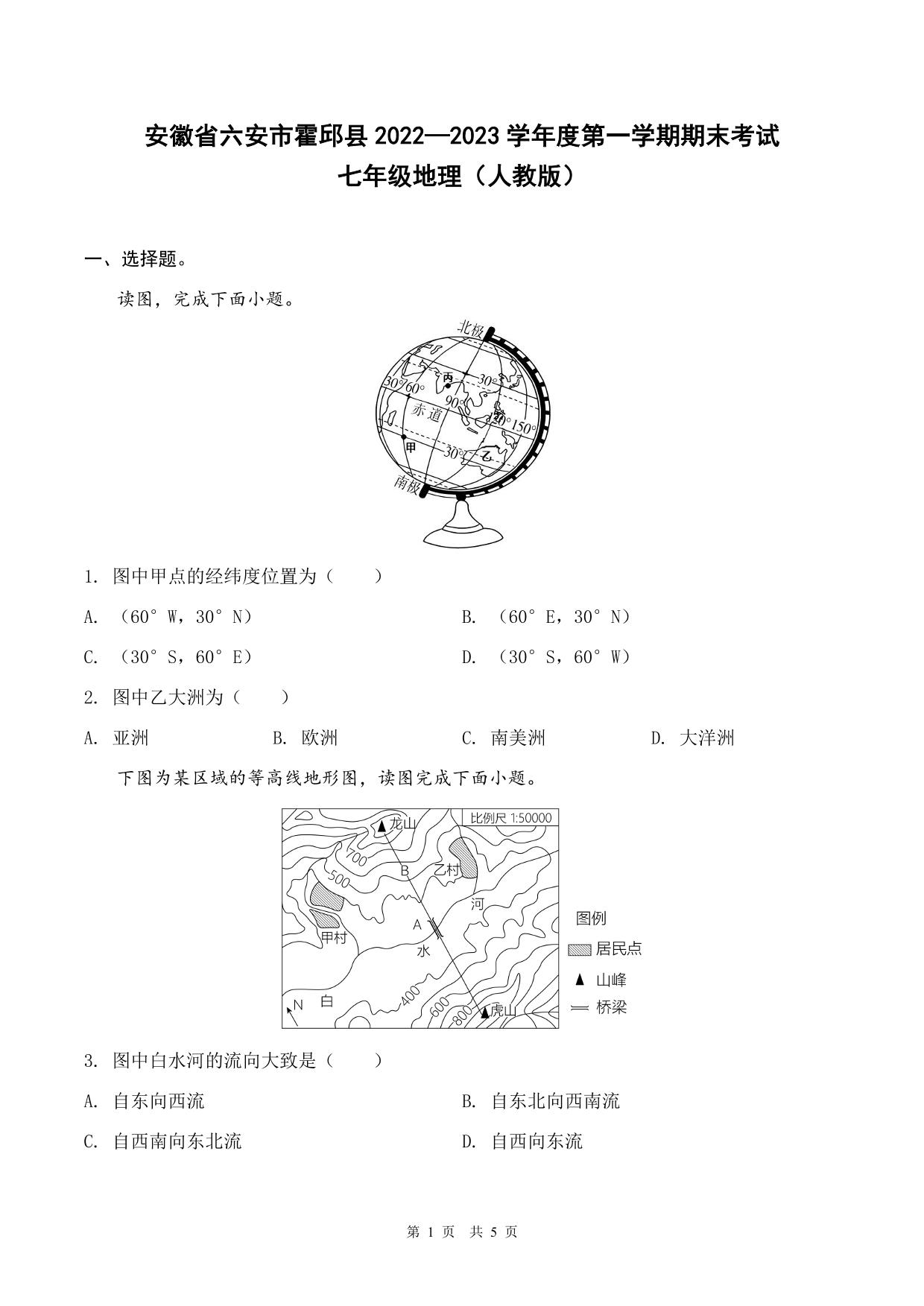 安徽省六安市霍邱县2022-2023学年度第一学期期末考试七年级地理(人教版)