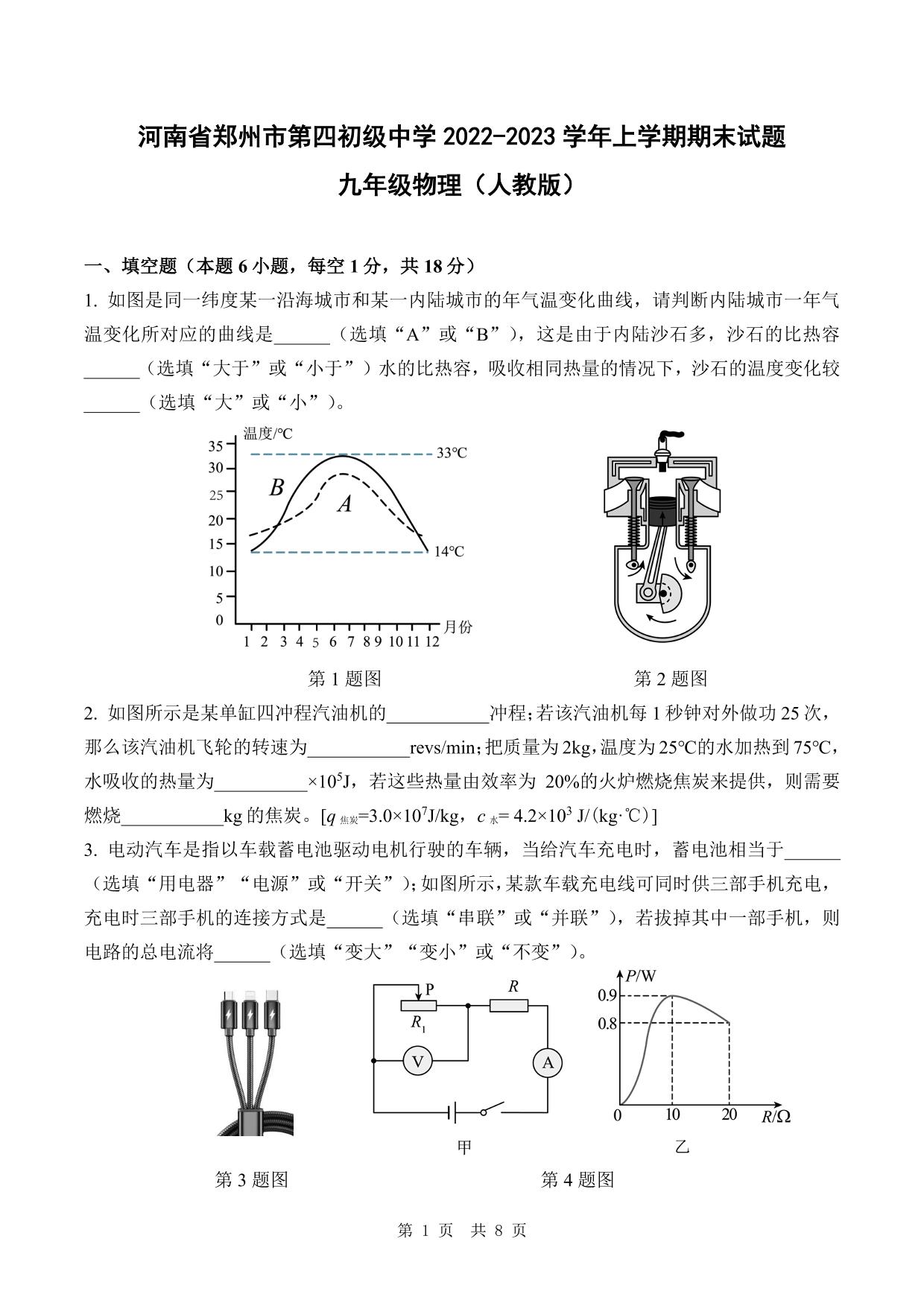 河南省郑州市第四初级中学2022-2023学年上学期期末试题九年级物理(人教版)