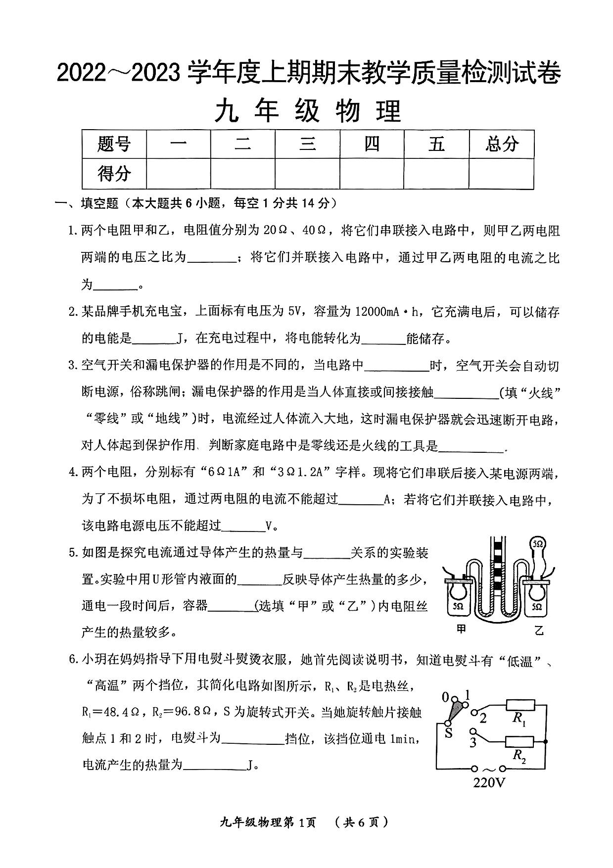 河南省漯河市郾城区2022-2023学年度上期期末教学质量检测试卷九年级物理(人教版)