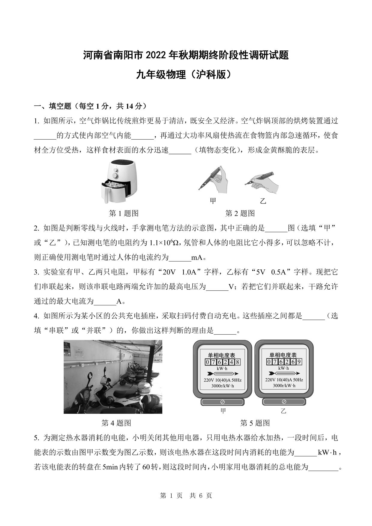 河南省南阳市2022年秋期期终阶段性调研试题九年级物理(沪科版)