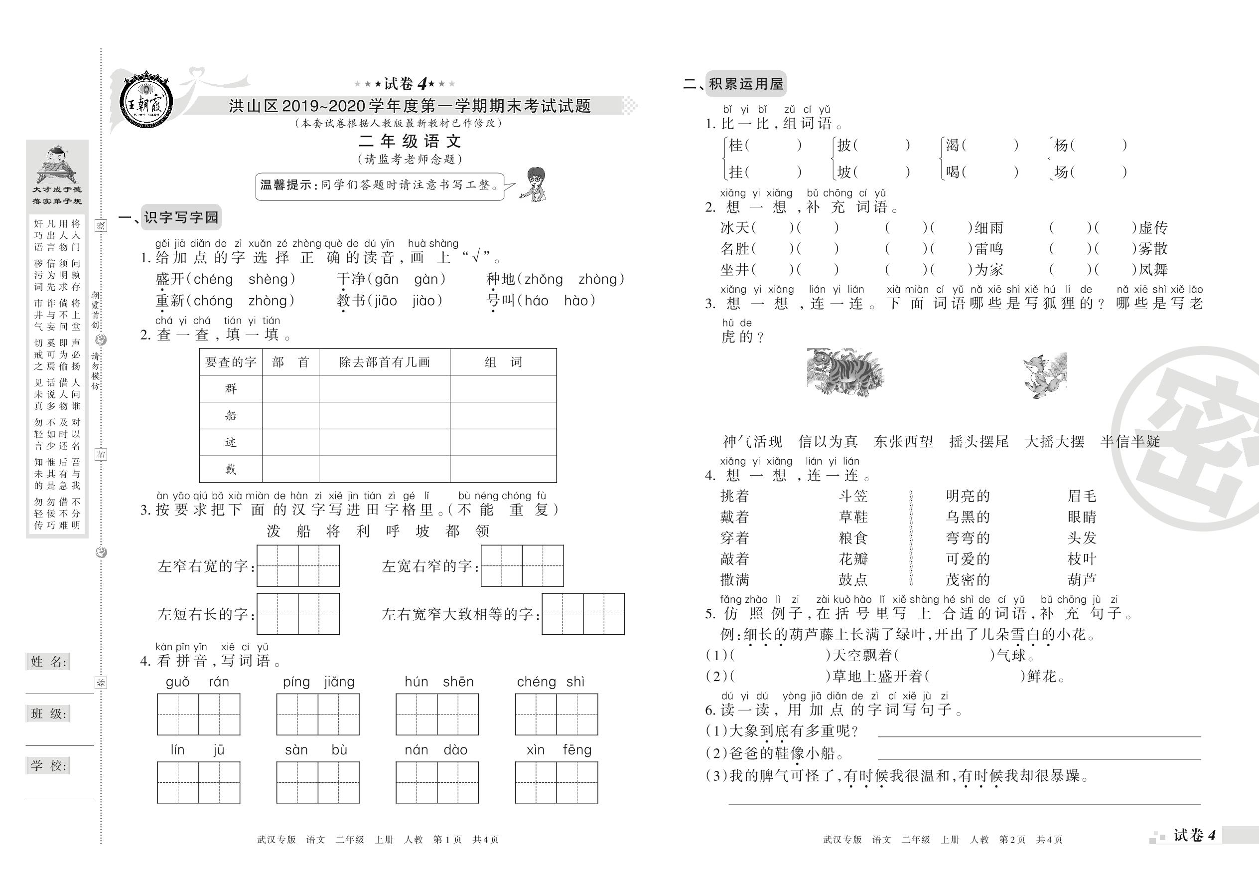 2019-2020学年第一学期武汉市洪山区二年级语文试卷(人教版)【4】