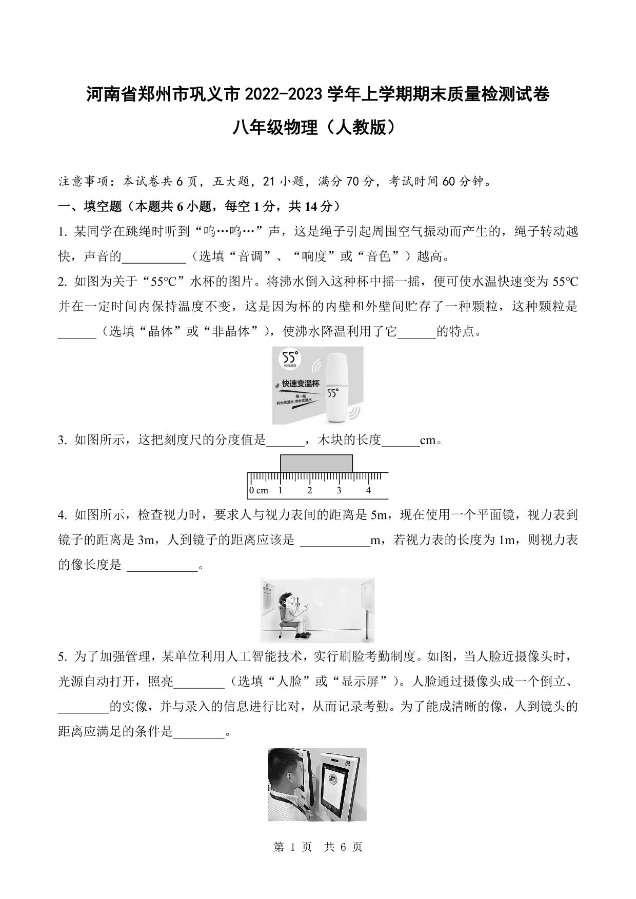 河南省郑州市巩义市2022-2023学年上学期期末质量检测试卷八年级物理(人教版)