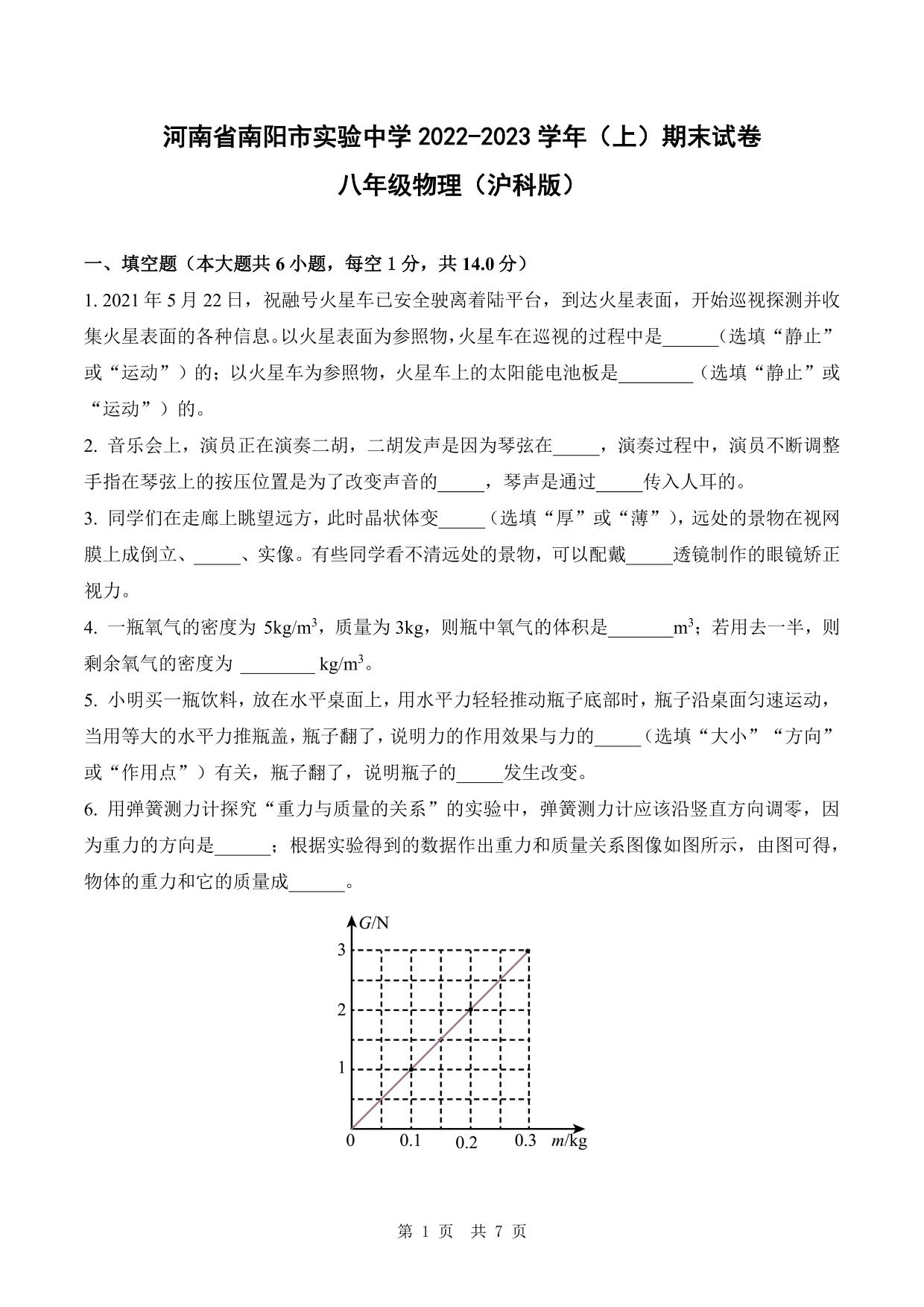 河南省南阳市实验中学2022-2023学年(上)期末试卷八年级物理(沪科版)