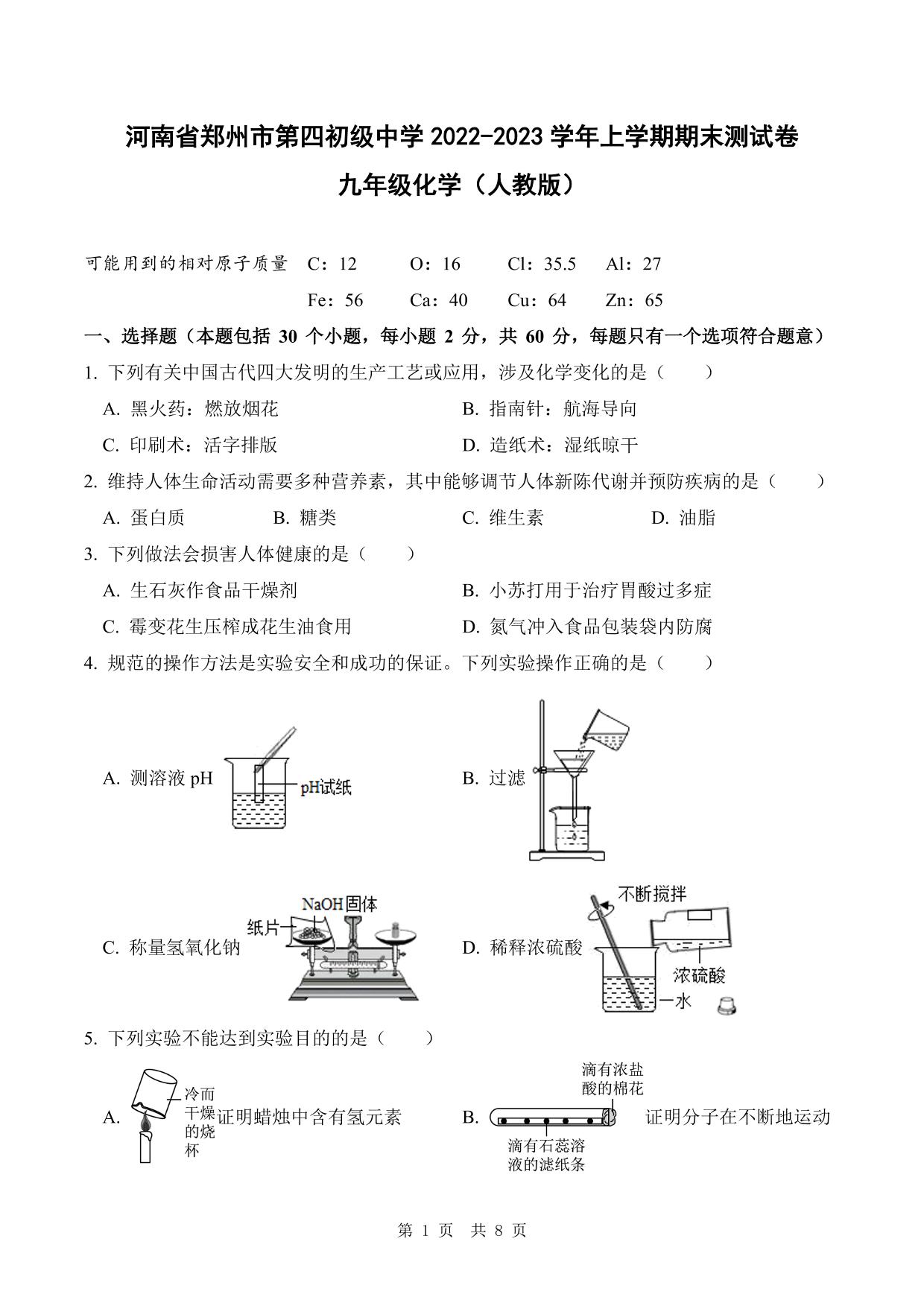 河南省郑州市第四初级中学2022-2023学年上学期期末测试卷九年级化学(人教版)