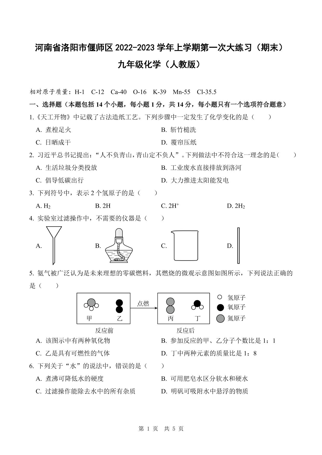 河南省洛阳市偃师区2022-2023学年上学期第一次大练习(期末)试题九年级化学(人教版)