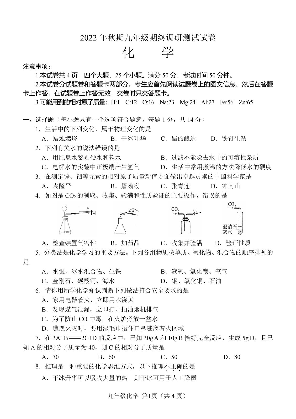河南省南阳市卧龙区2022年秋期期终调研测试试卷九年级化学(人教版)