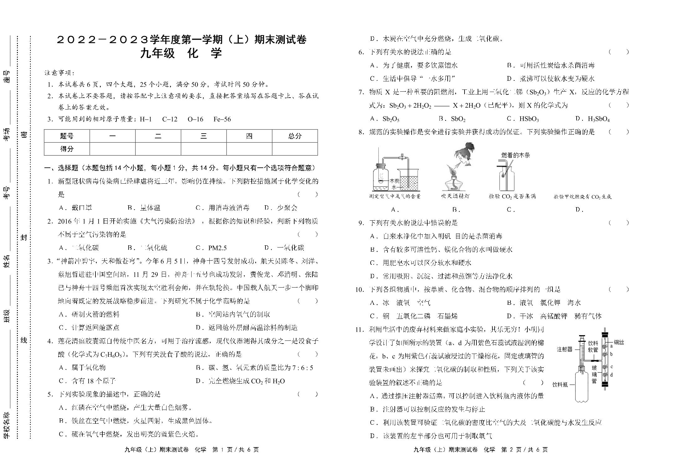 河南省商丘市永城市2022-2023学年度第一学期(上)期末测试卷九年级化学(人教版)