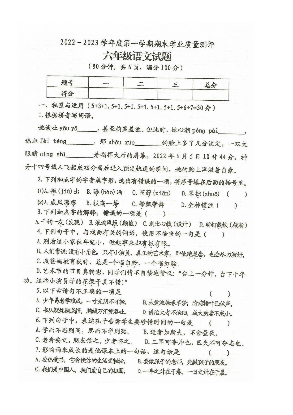 江苏省连云港市2022-2023学年度六年级第一学期期末学业质量监测语文试题(人教版)