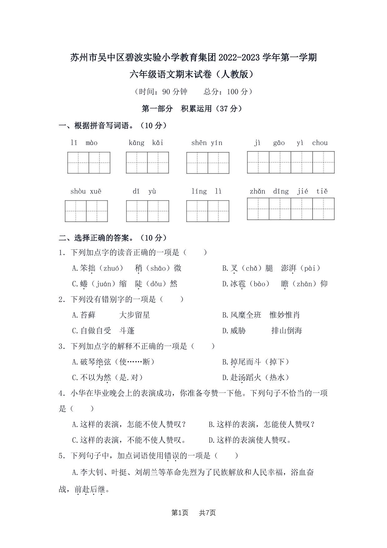 江苏省苏州市吴中区碧波实验小学教育集团2022-2023学年第一学期六年级语文期末试卷(人教版)