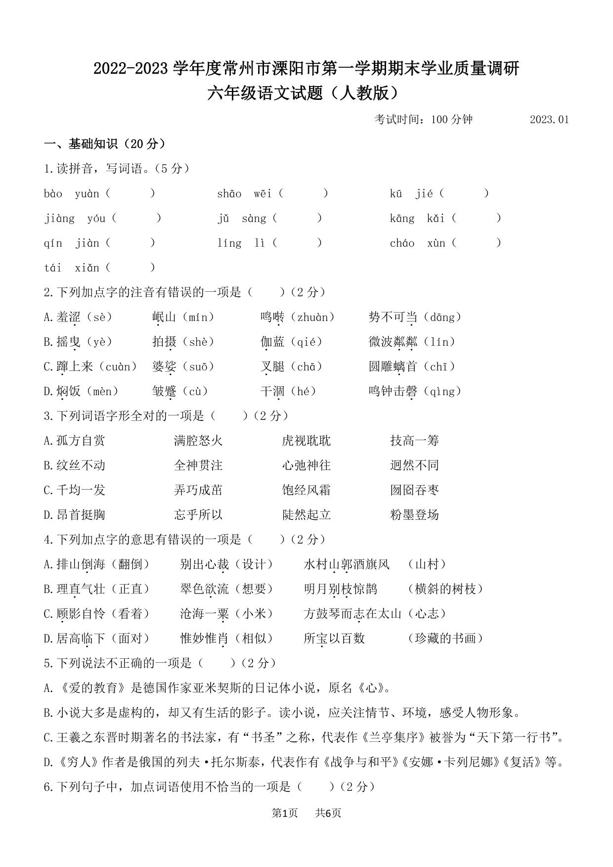 江苏省常州市溧阳市2022-2023学年度第一学期期末学业质量调研六年级语文试题(人教版)