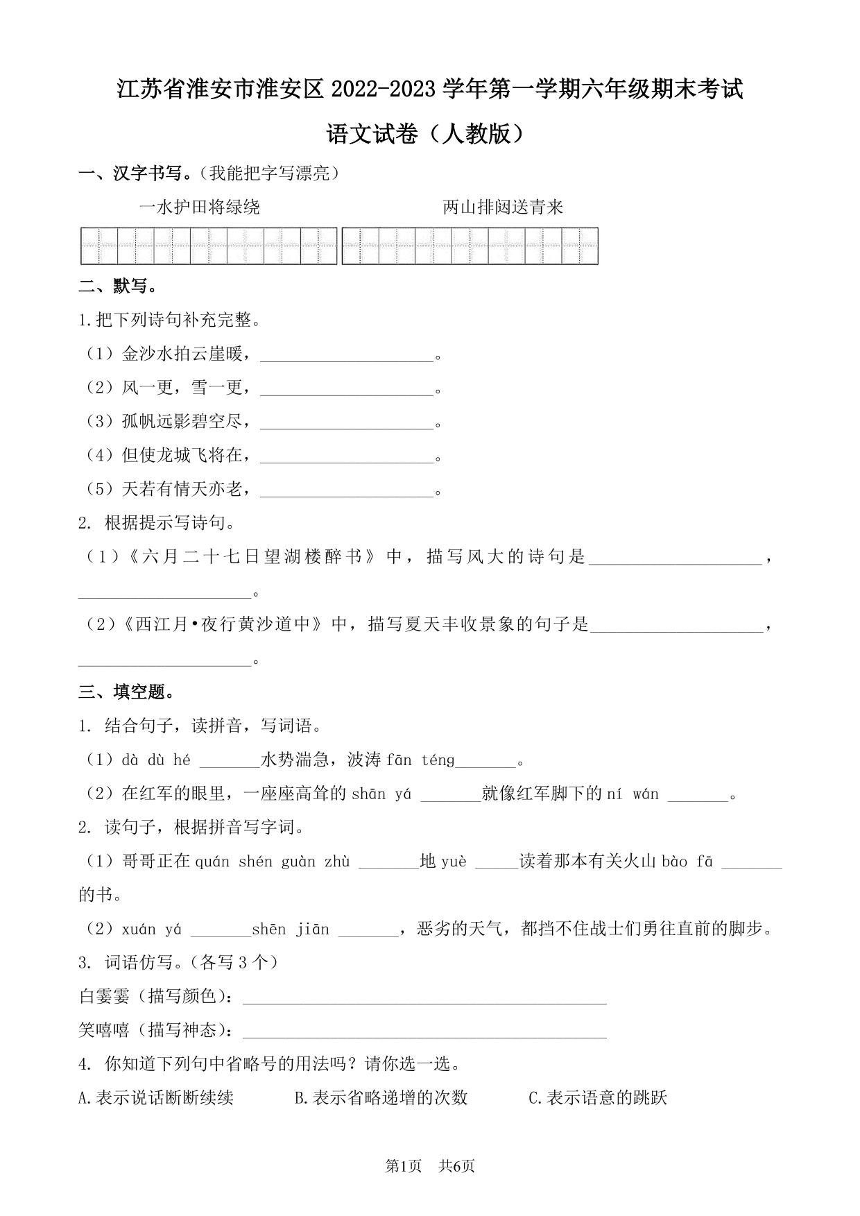 江苏省淮安市淮安区2022-2023学年第一学期六年级期末考试语文试卷(人教版)