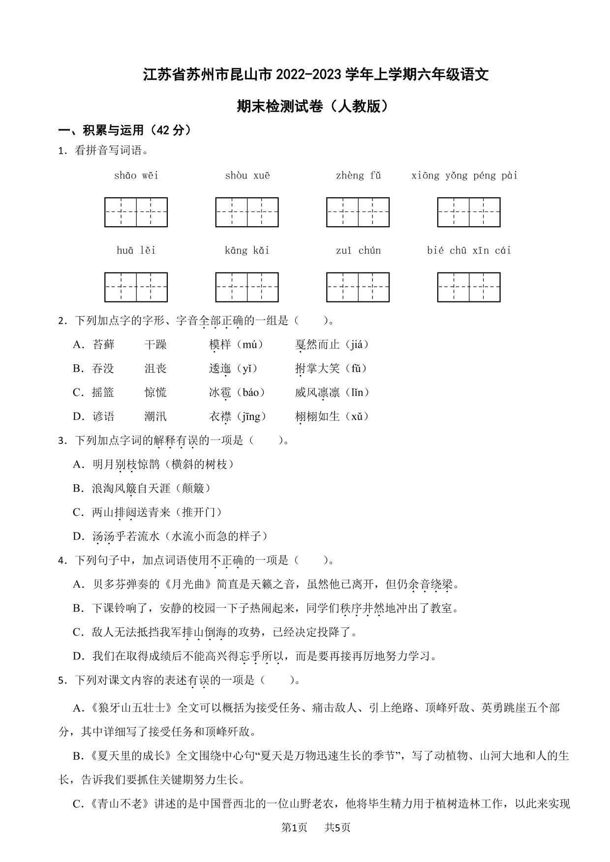 江苏省苏州市昆山市2022-2023学年上学期六年级语文期末检测试卷(人教版)