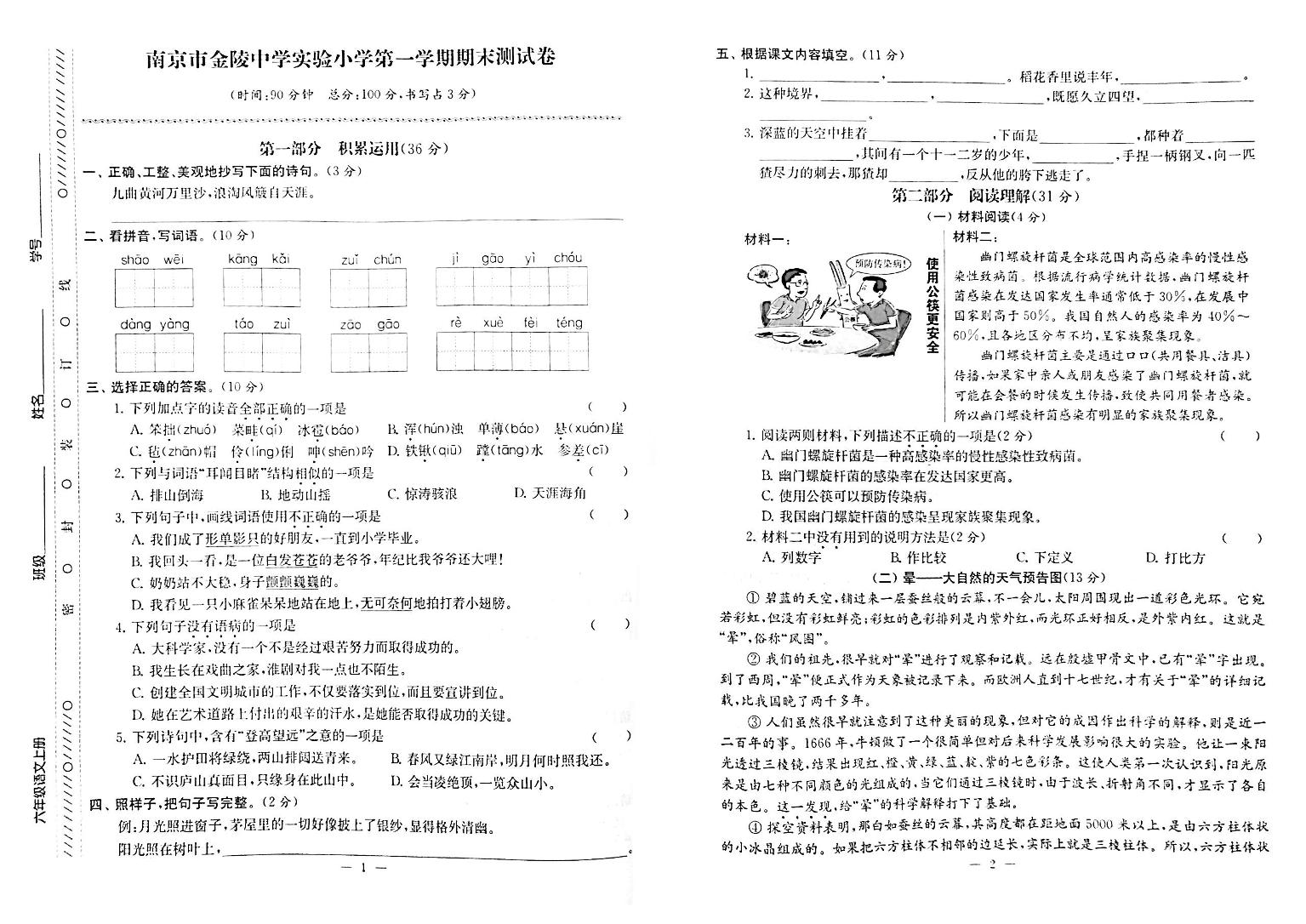 江苏省南京市金陵中学实验小学2022-2023学年第一学期六年级期末检测语文试卷(人教版)