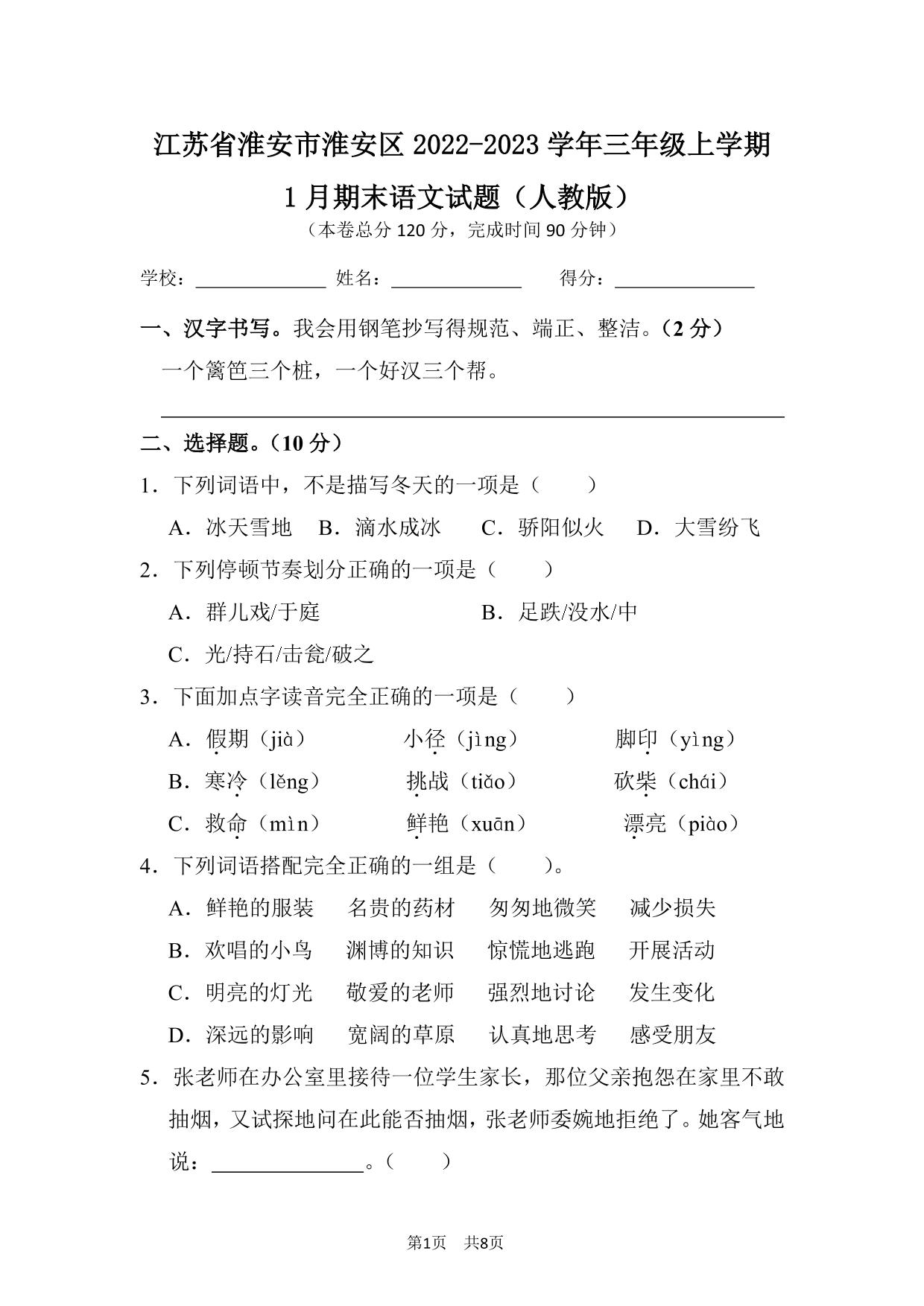 江苏省淮安市淮安区2022-2023学年第一学期三年级1月期末语文试题(人教版)