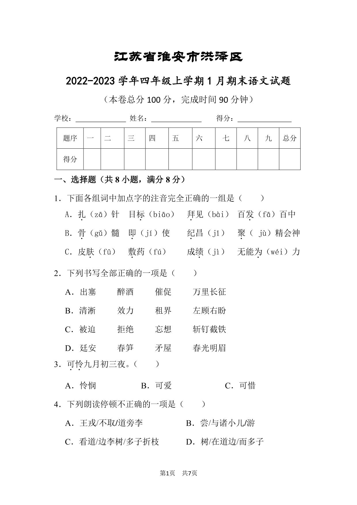 江苏省淮安市洪泽区2022-2023学年第一学期四年级1月期末语文试题(人教版)