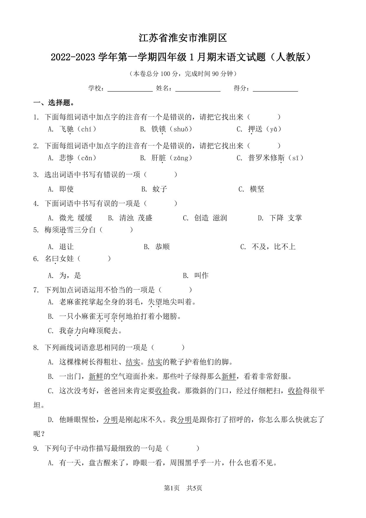 江苏省淮安市淮阴区2022-2023学年第一学期四年级1月期末语文试题(人教版)