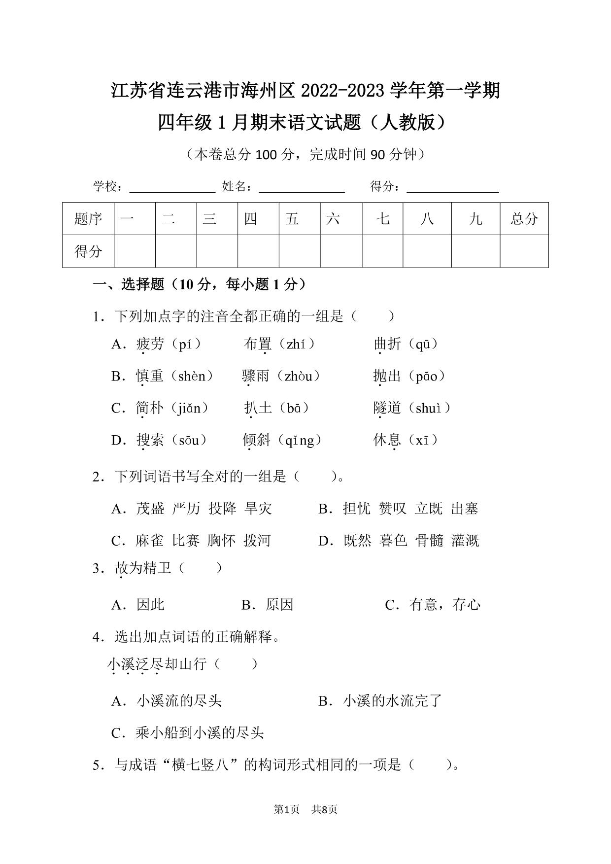 江苏省连云港市海州区2022-2023学年第一学期四年级1月期末语文试题(人教版)