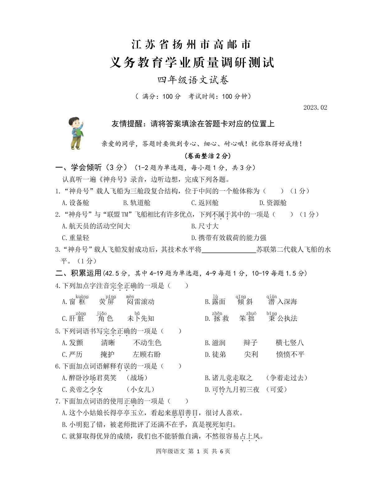 江苏省扬州市高邮市2022-2023学年第一学期期末义务教育学业质量调研测试四年级语文试卷(人教版)