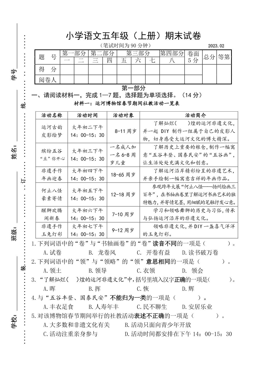 江苏省扬州市江都区2022-2023学年第一学期小学语文五年级期末试卷(人教版)