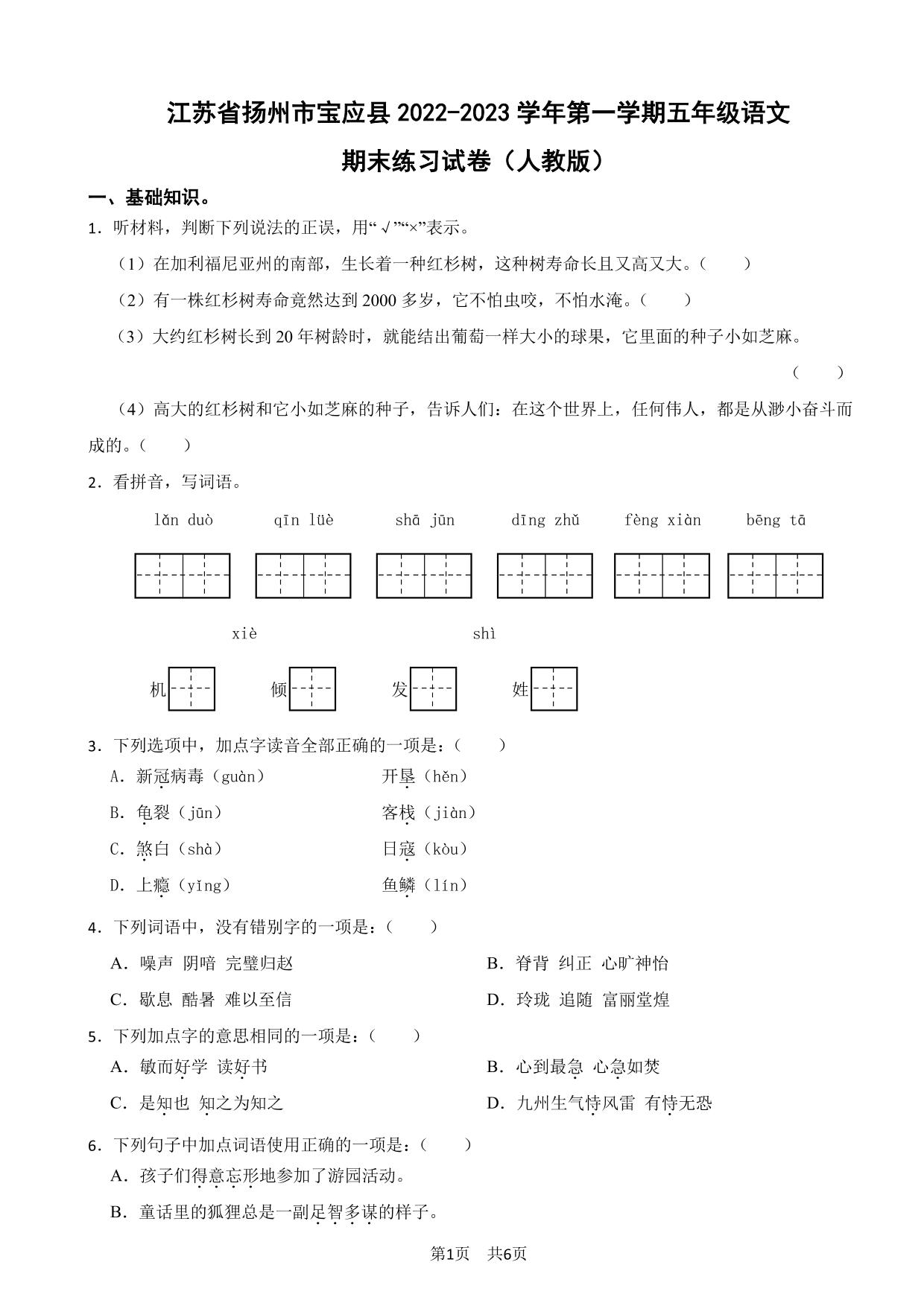 江苏省扬州市宝应县2022-2023学年第一学期五年级语文期末练习试卷(人教版)