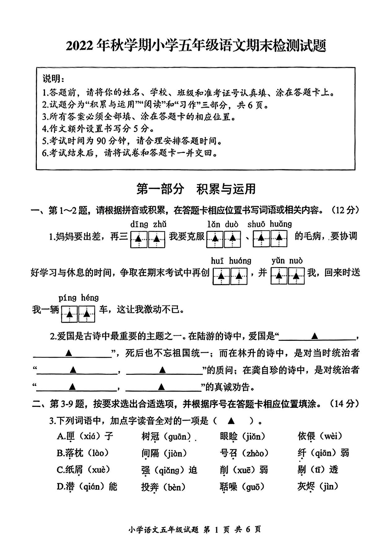江苏省盐城市大丰区2022-2023学年第一学期小学五年级语文期末检测试题(人教版)