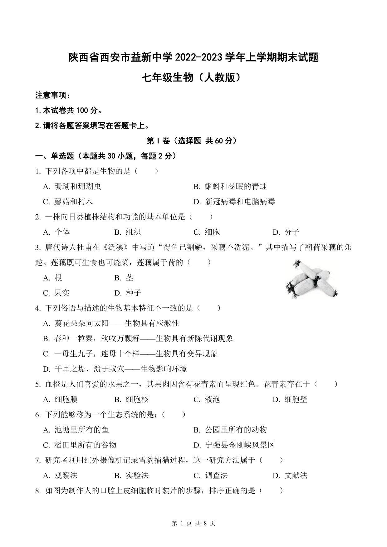 陕西省西安市益新中学2022—2023学年上学期期末试题七年级生物(人教版)