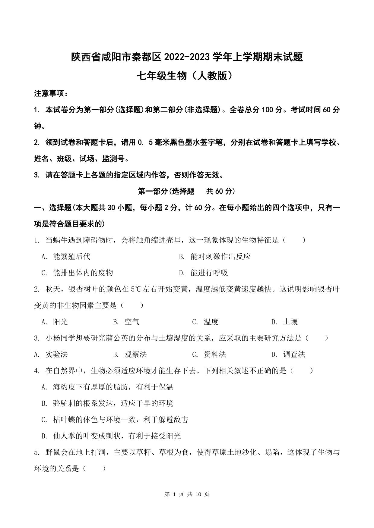 陕西省咸阳市秦都区2022—2023学年上学期期末试题七年级生物(人教版)