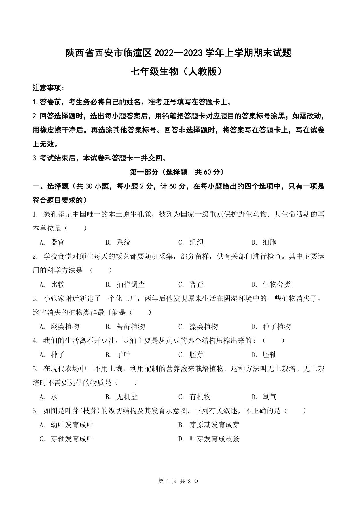 陕西省西安市临潼区2022—2023学年上学期期末试题七年级生物(人教版)