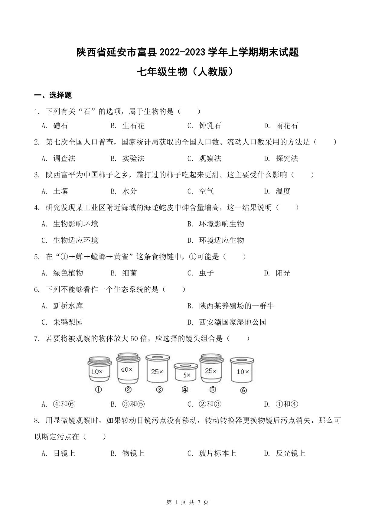 陕西省延安市富县2022—2023学年上学期期末试题七年级生物(人教版)