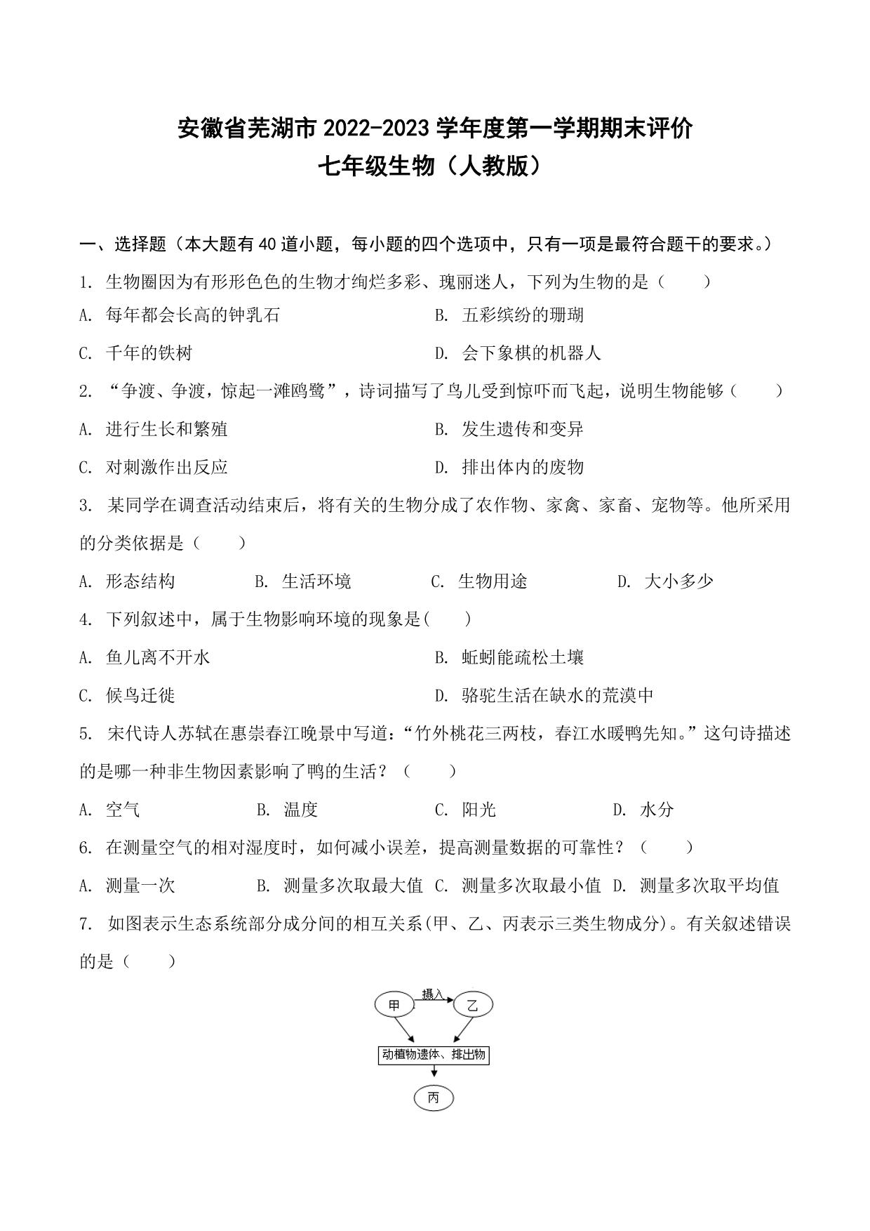 安徽省芜湖市2022-2023学年度第一学期期末评价七年级生物(人教版)