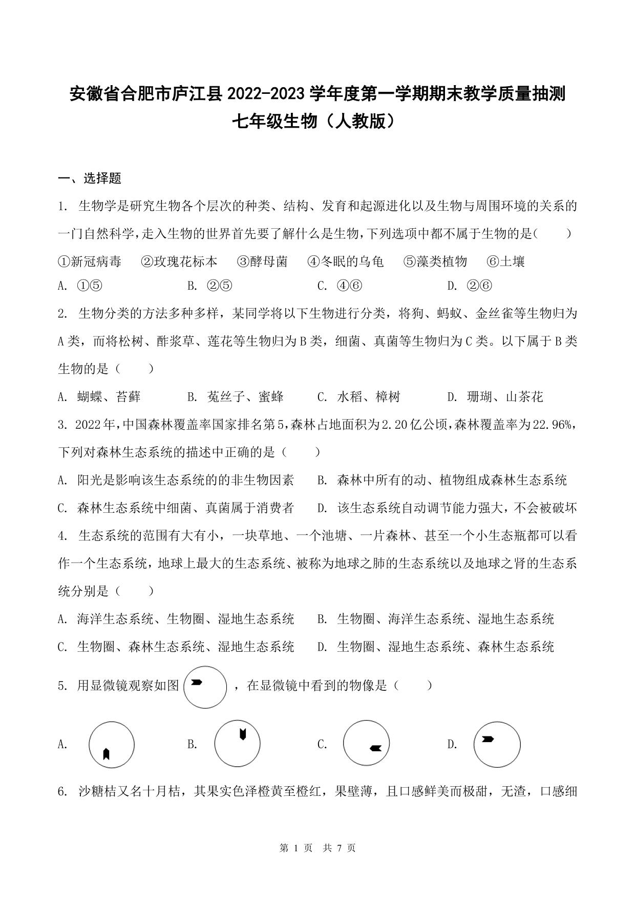 安徽省合肥市庐江县2022-2023学年度第一学期期末教学质量抽测七年级生物(人教版)