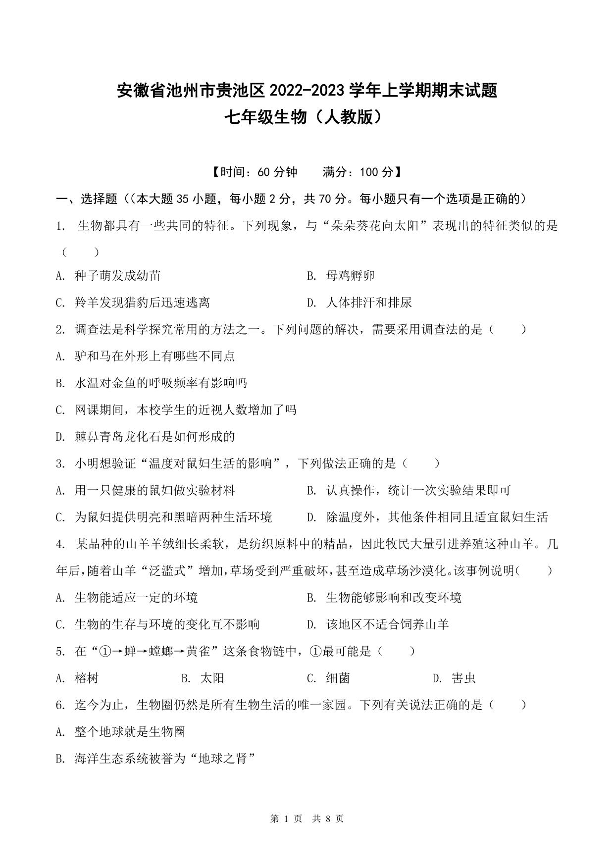 安徽省池州市贵池区2022-2023学年上学期期末试题七年级生物(人教版)