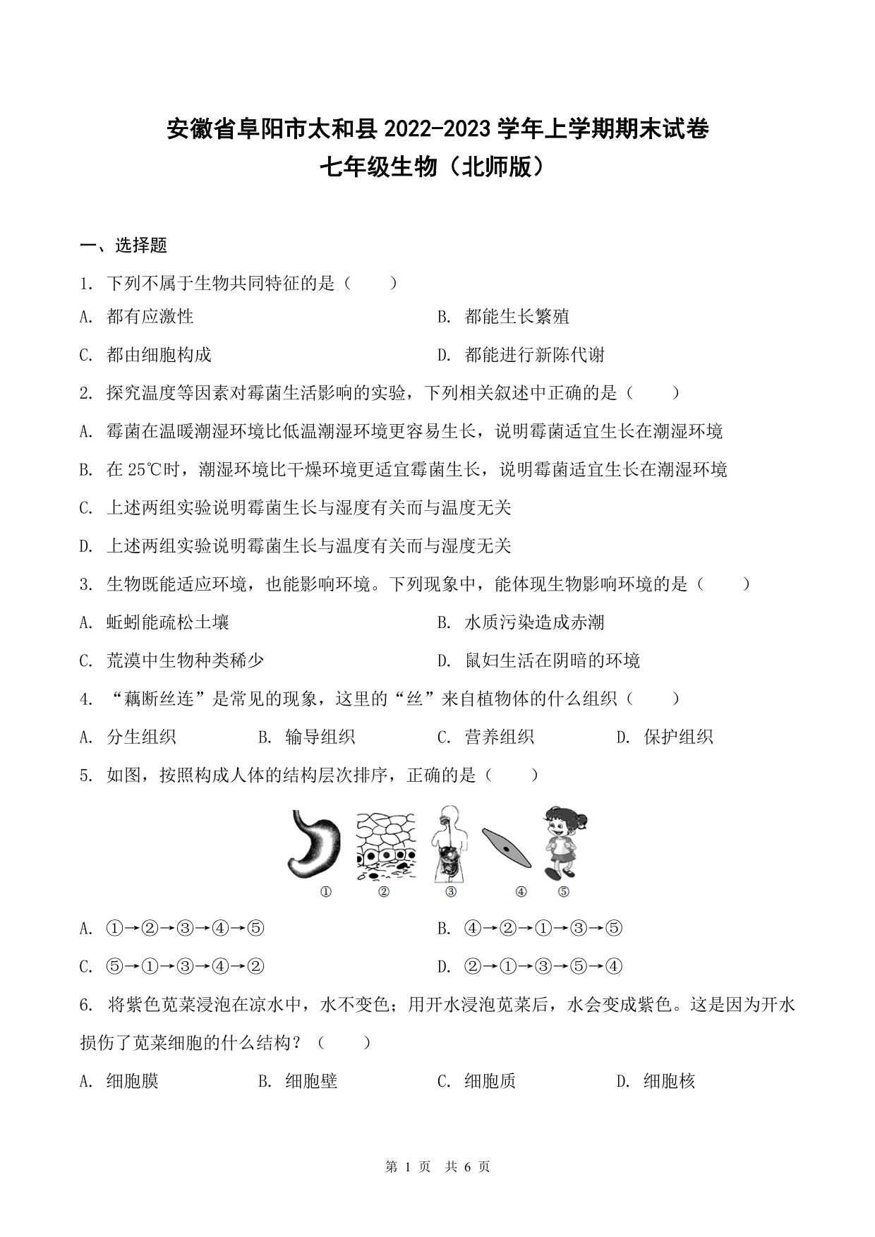 安徽省阜阳市太和县2022-2023学年上学期期末考试七年级生物(北师版)