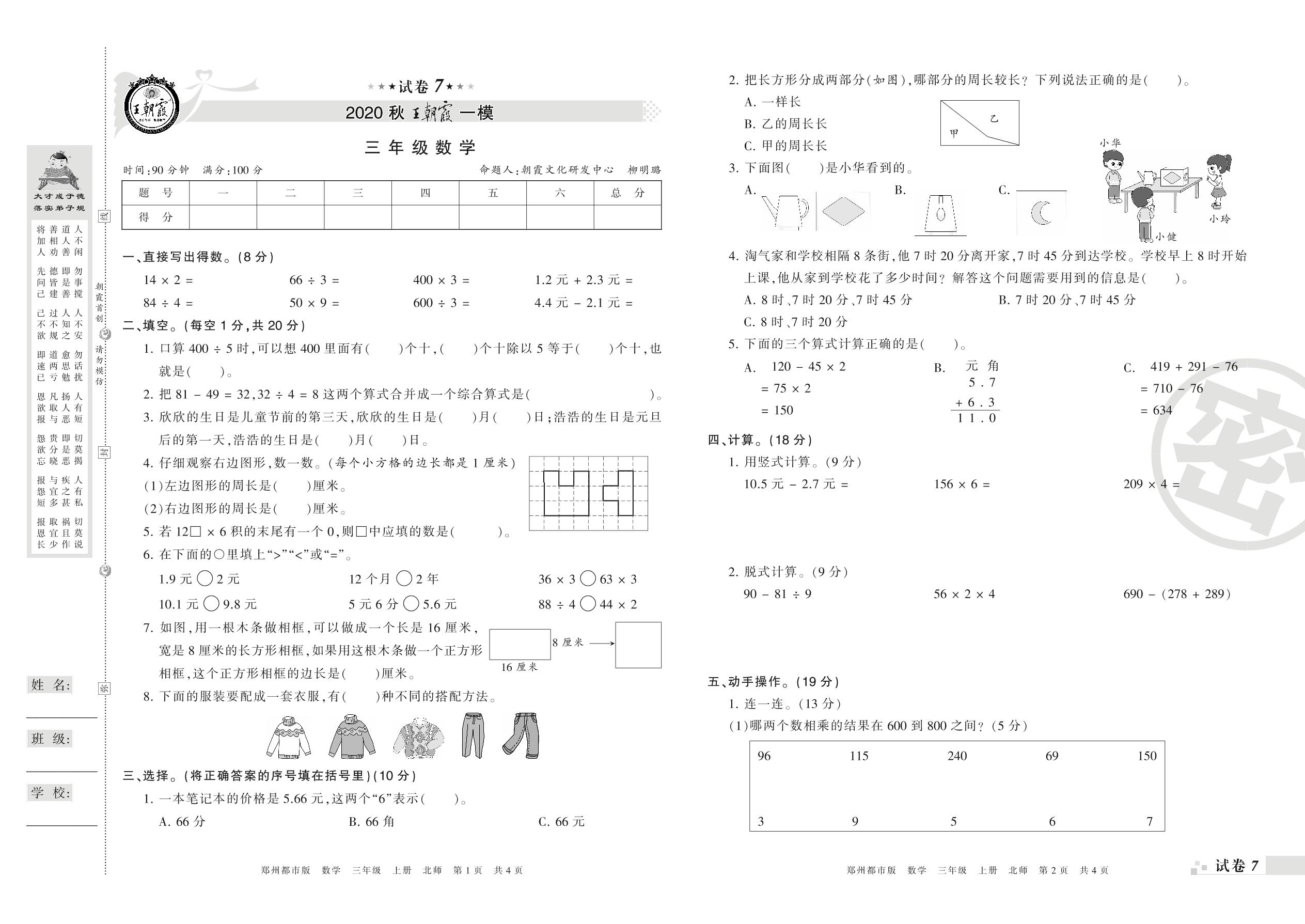 王朝霞期末模拟卷三年级上册数学(北师版)_R21080492235【7】