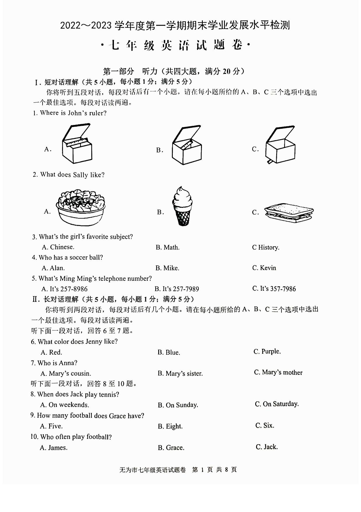 安徽省芜湖市无为市2022-2023学年度第一学期期末发展水平检测七年级英语(人教版)【无听力音频】