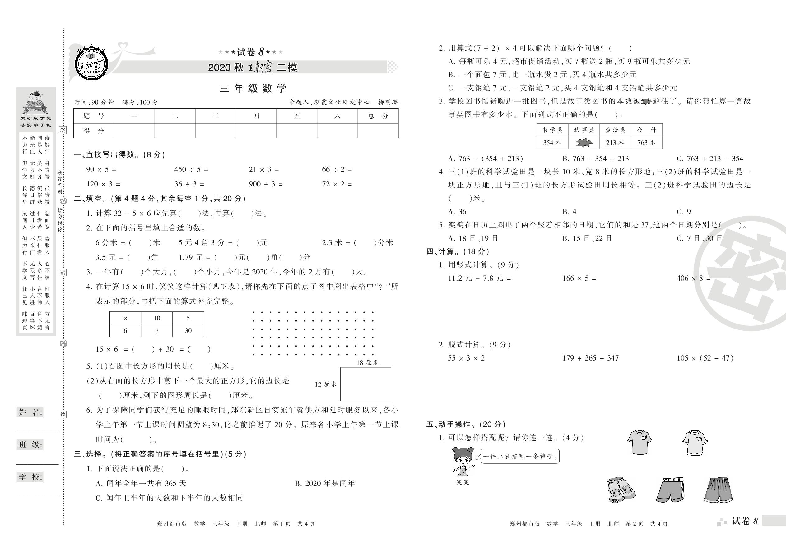 王朝霞期末模拟卷三年级上册数学(北师版)_R21080492240【8】