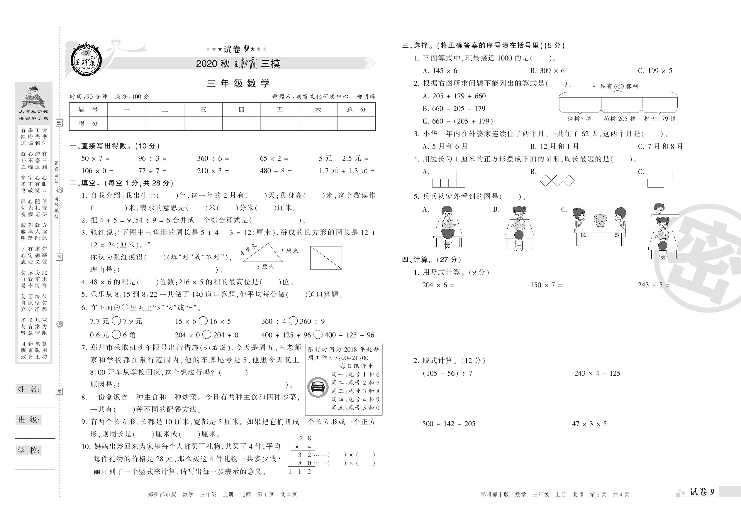 王朝霞期末模拟卷三年级上册数学(北师版)_R21080492245【9】